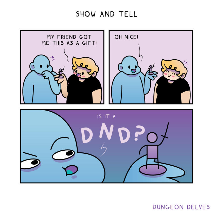 In 2018, I started a tumblr blog with the intention of drawing a little something everyday, and picked the topic of TTRPGs as inspiration. That blog turned into comics about tabletop games, and Dungeon Delves were born. From there I gained a modest following across several social media platforms, and created enough comics to make 2 collections: Vol. 1 centered around players, and Vol. 2 focusing on game masters.You can find my comics for sale in my ko-fi shop, or read them on Tapas.